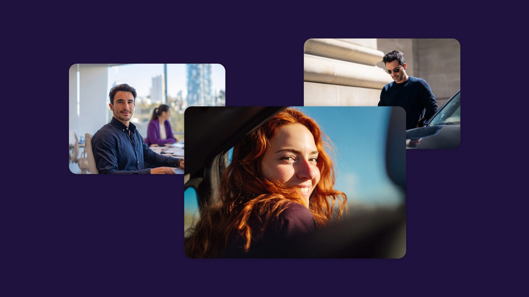 Spanish woman, 27, with long red hair, wearing a purple shirt, smiling at the camera from the back seat of a premium black car. The window creates a blurred vignette focusing on her face. Cinematic style, vibrant sunlight, slightly off-center composition. Mood: cheerful, natural, confident. Shot on Canon EOS 5D Mark IV, 50mm f/1.4, shallow depth of field, beautiful bokeh.